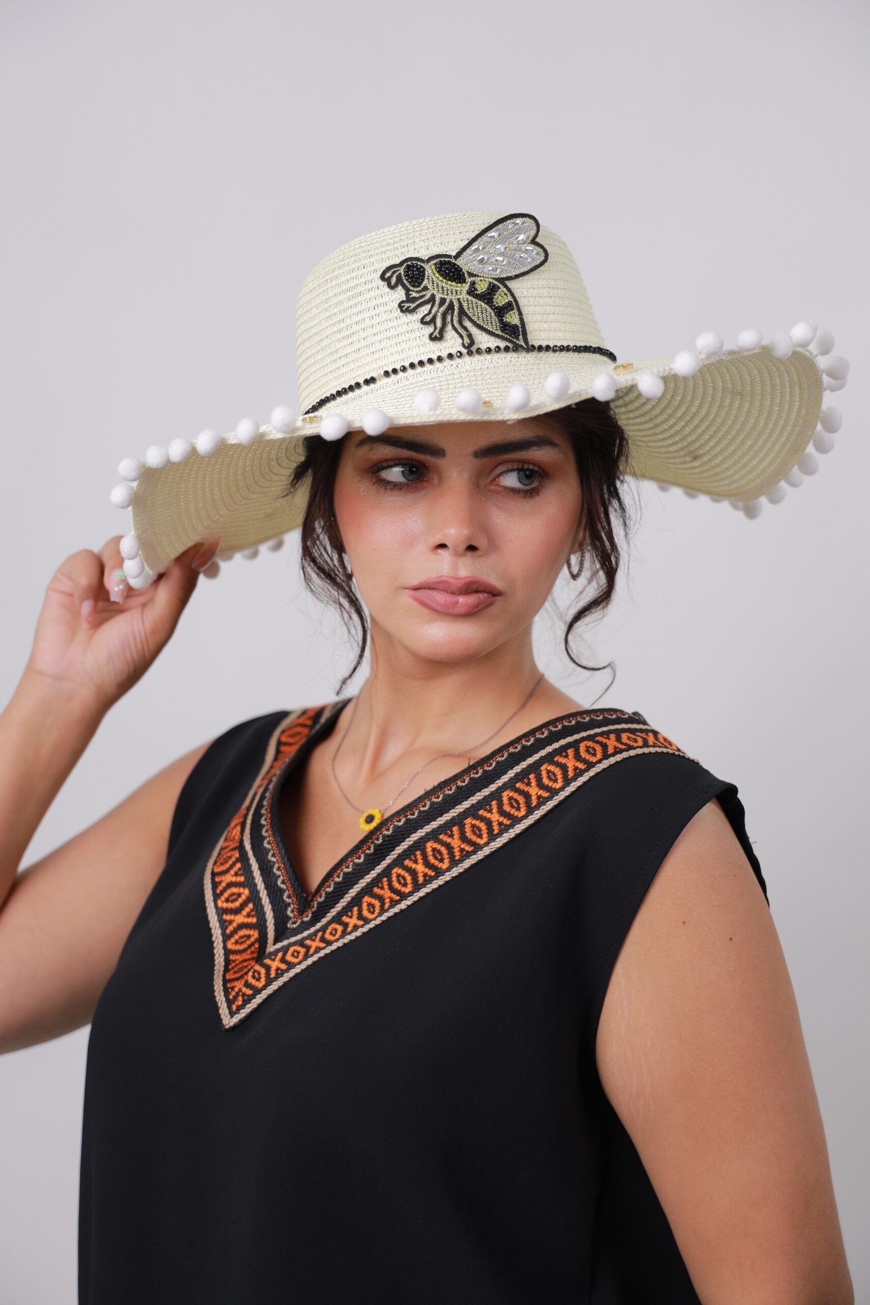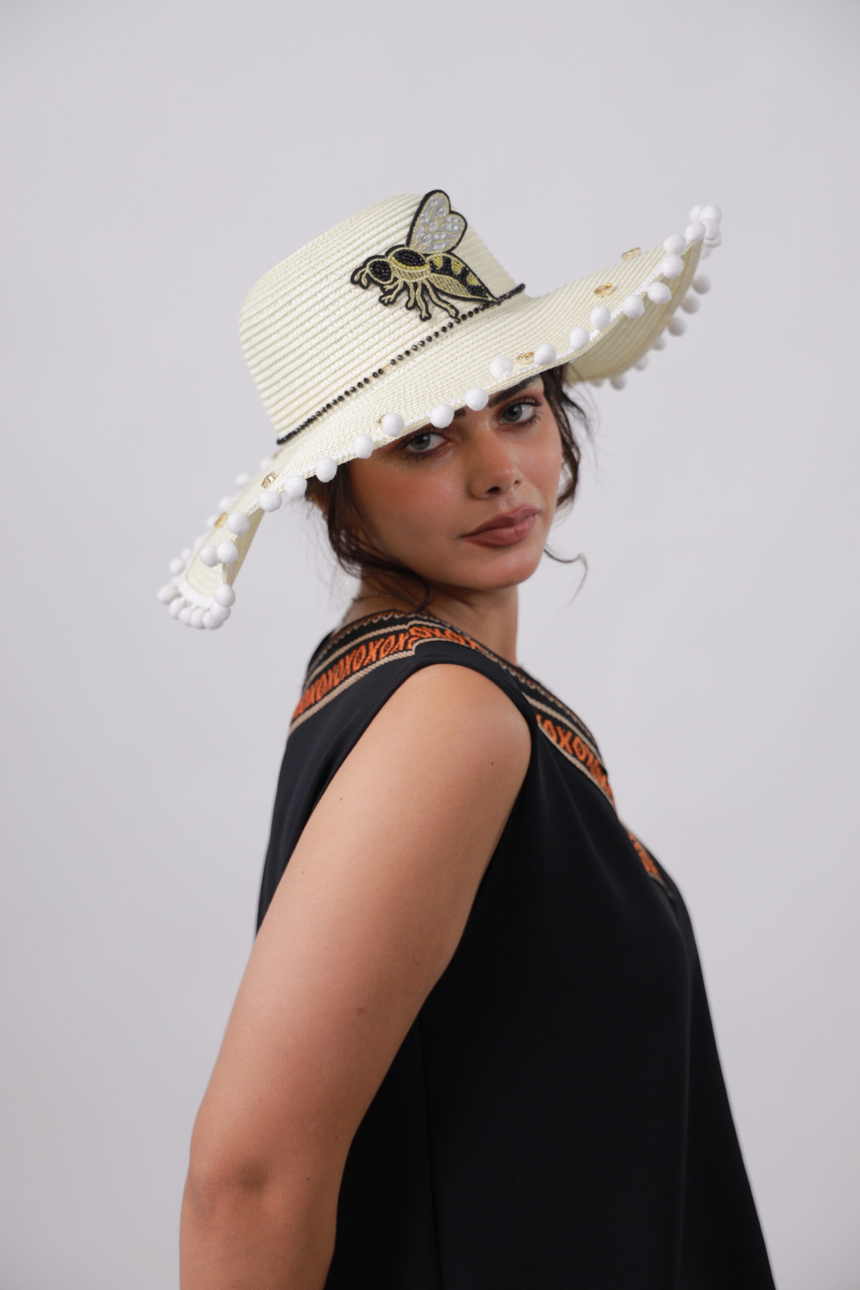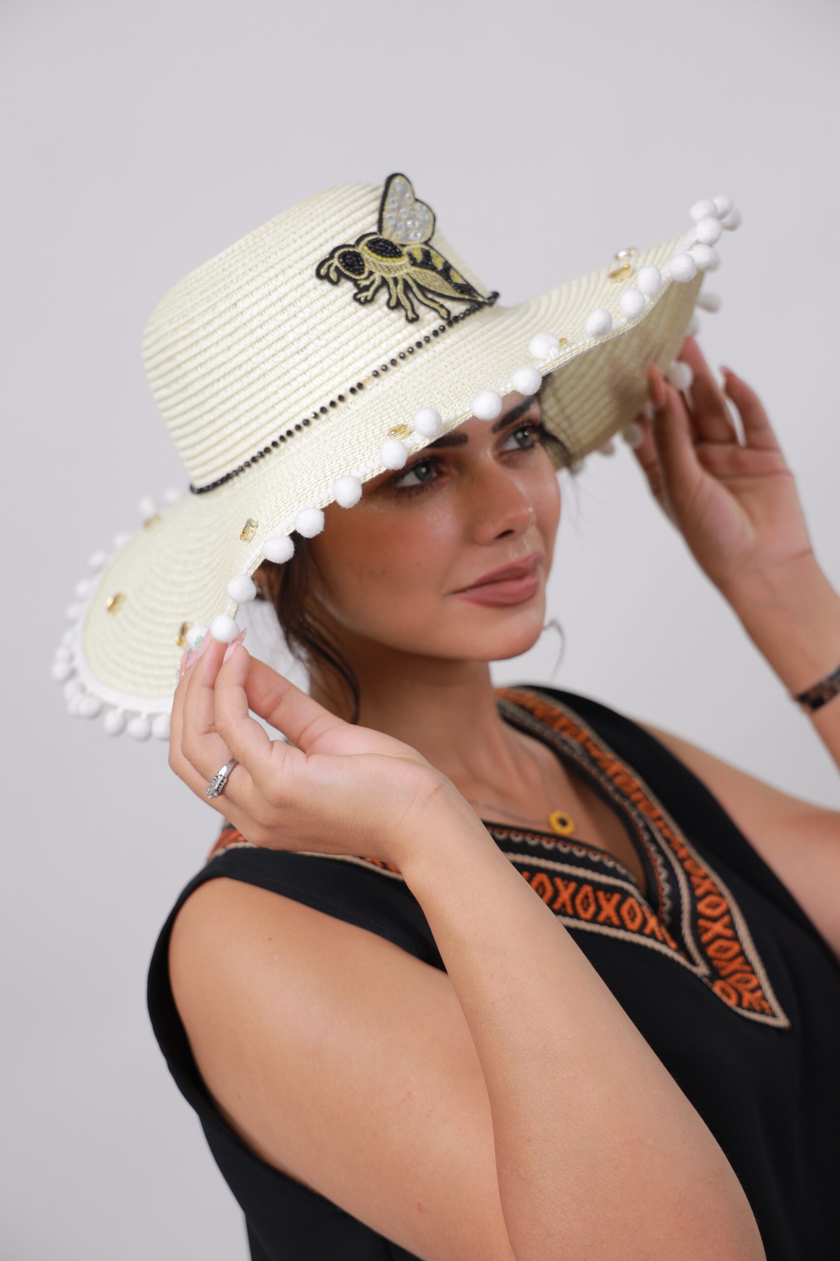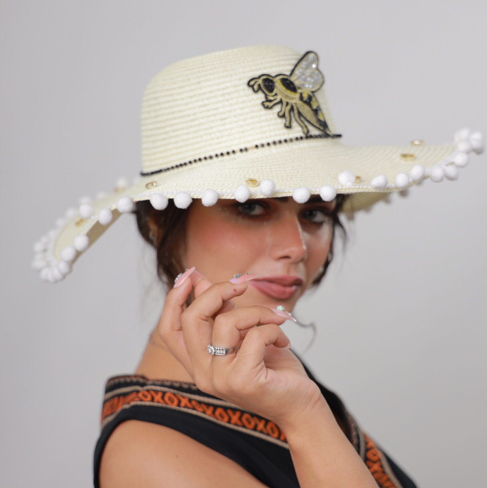 Add a playful buzz to your summer style with this elegant straw beach hat.