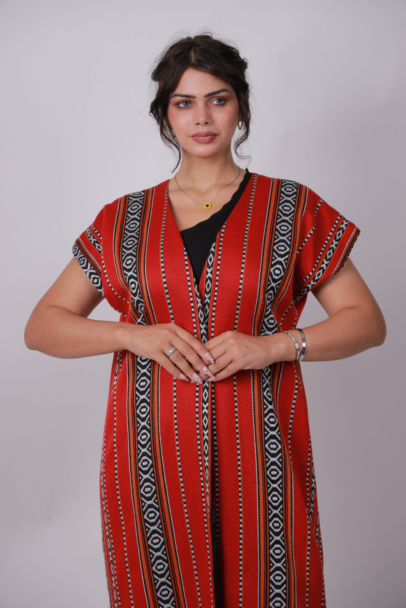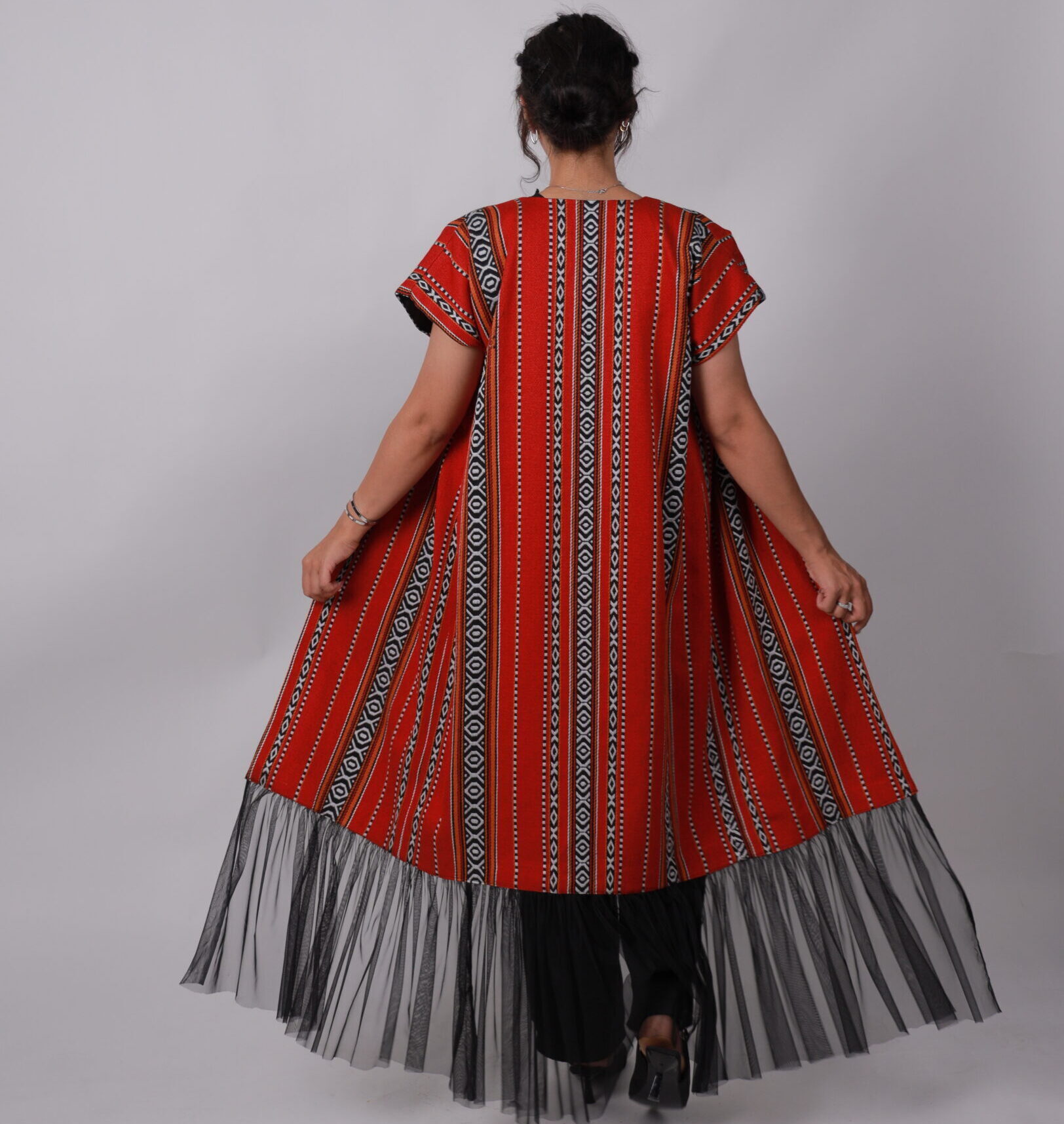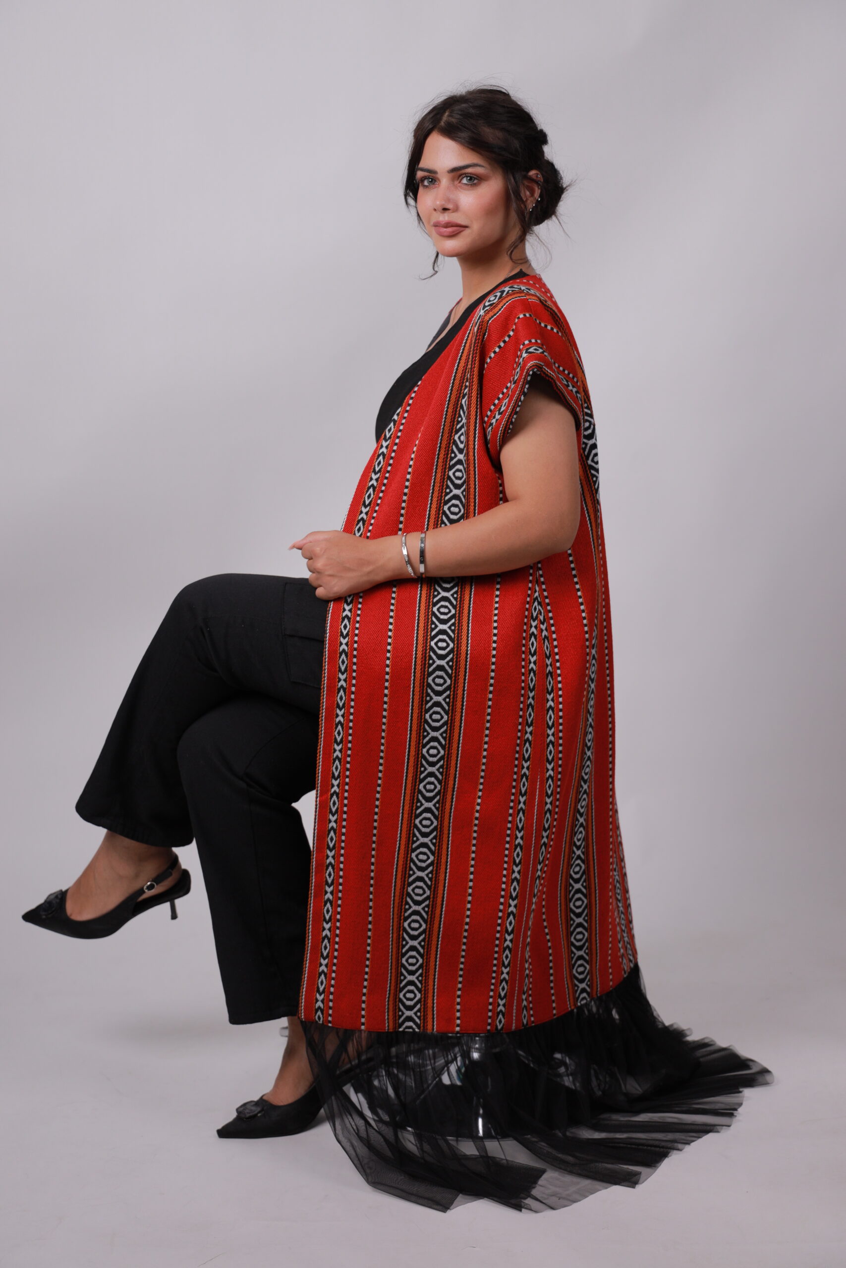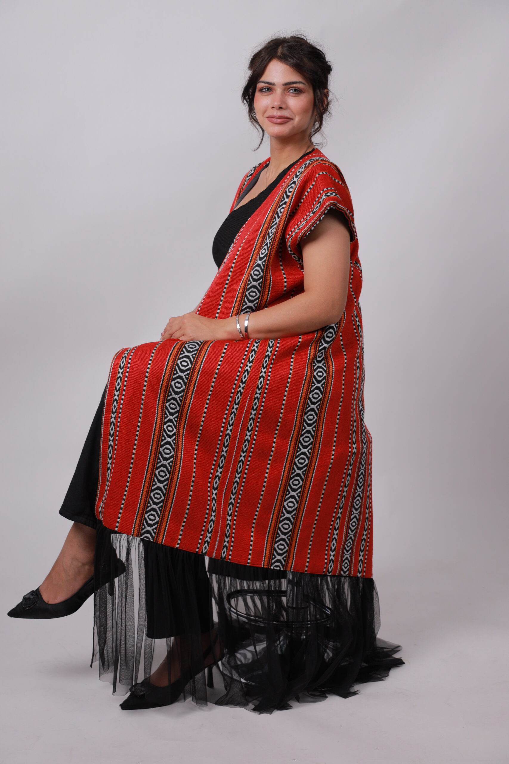 Make a stunning entrance at henna celebrations with this vibrant red cape, highlighted by classic Sadu-inspired stripes and a flowing black tulle hem. The sleeveless, open-front design drapes effortlessly, creating a graceful and airy movement with every step. Perfect for layering over simple attire, it adds an unmistakable festive elegance to any special occasion.