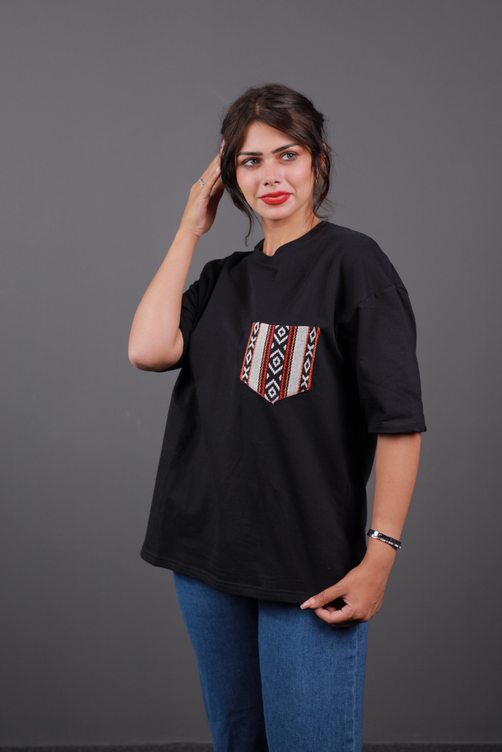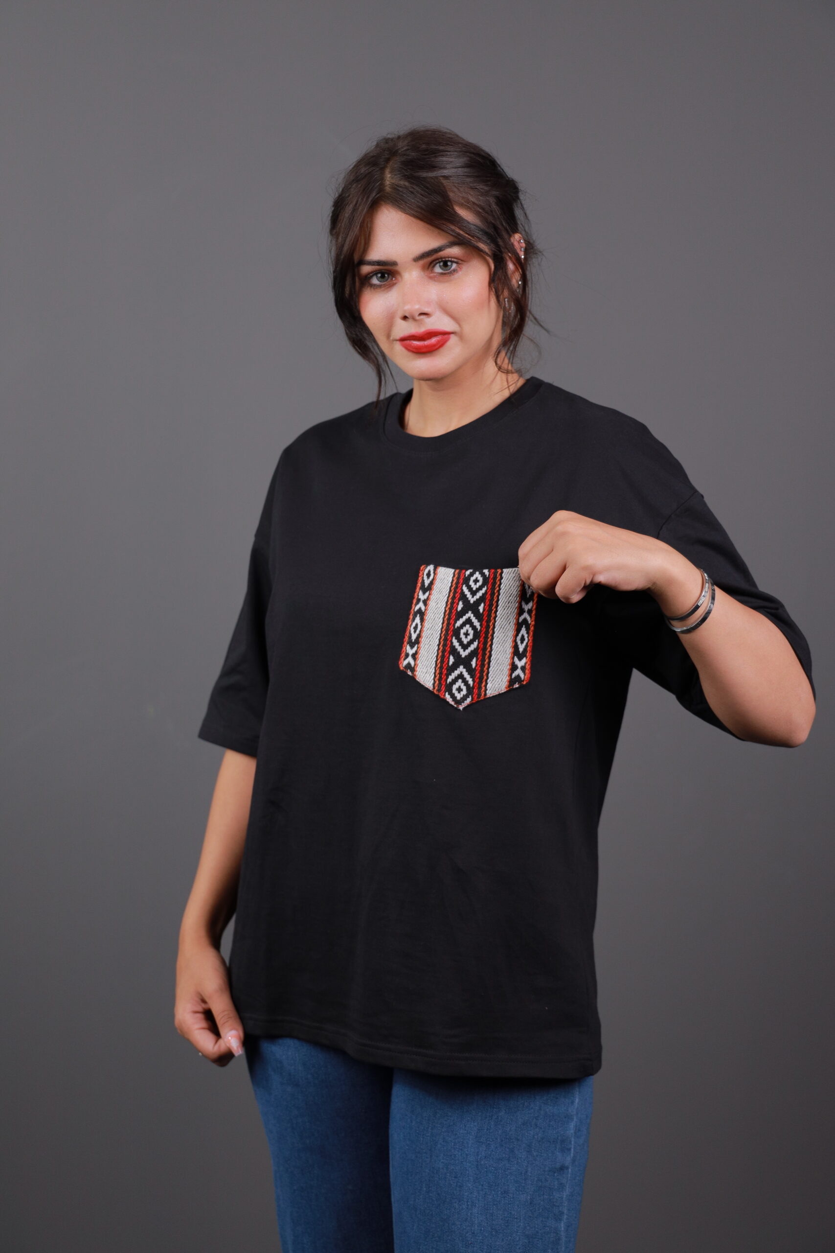 Relaxed-oversize T-Shirt crafted from 100% pure Egyptian cotton for a naturally soft, breathable feel. Features a bold Sadu-inspired pocket and matching sleeve trims, adding a touch of traditional flair to a modern silhouette. Perfect for casual days.
