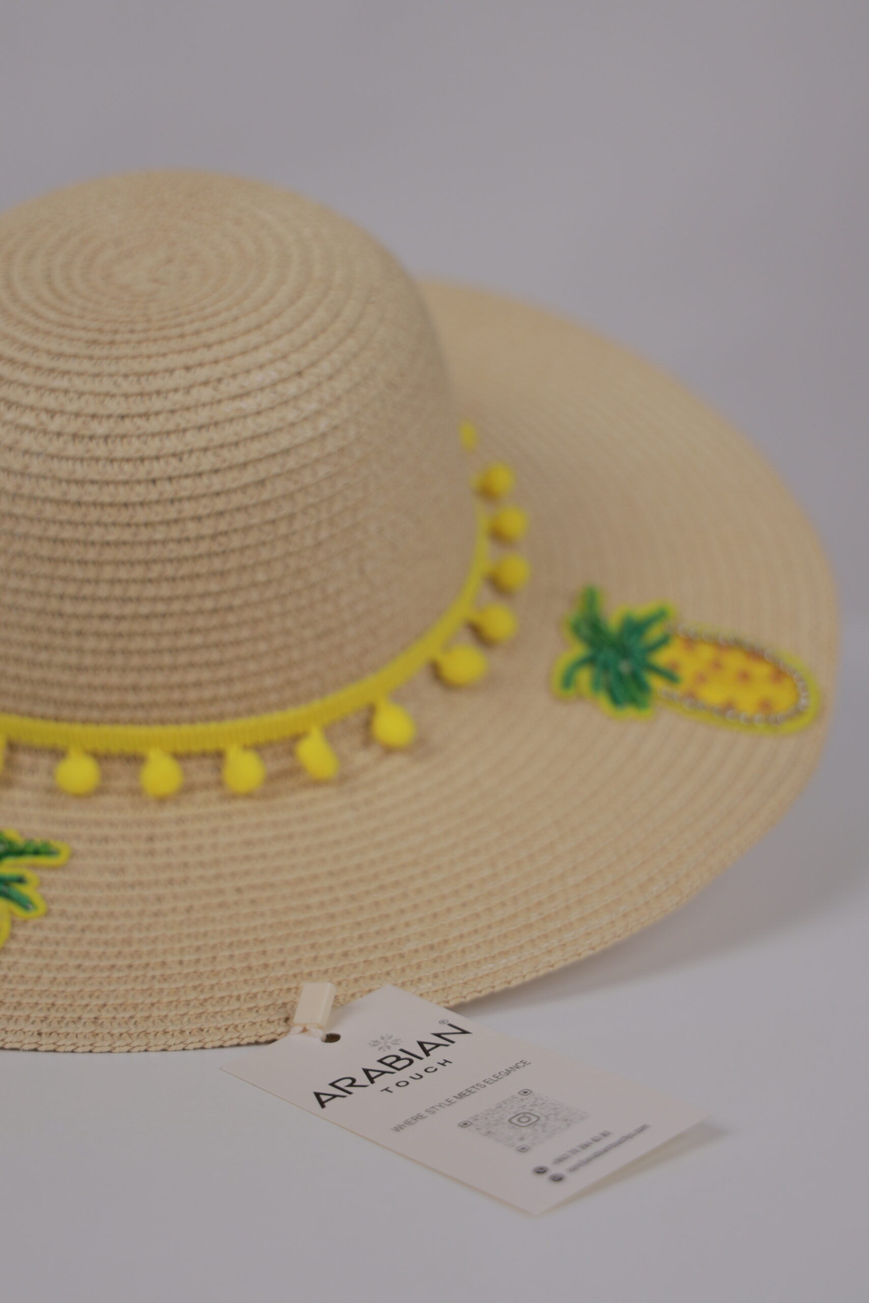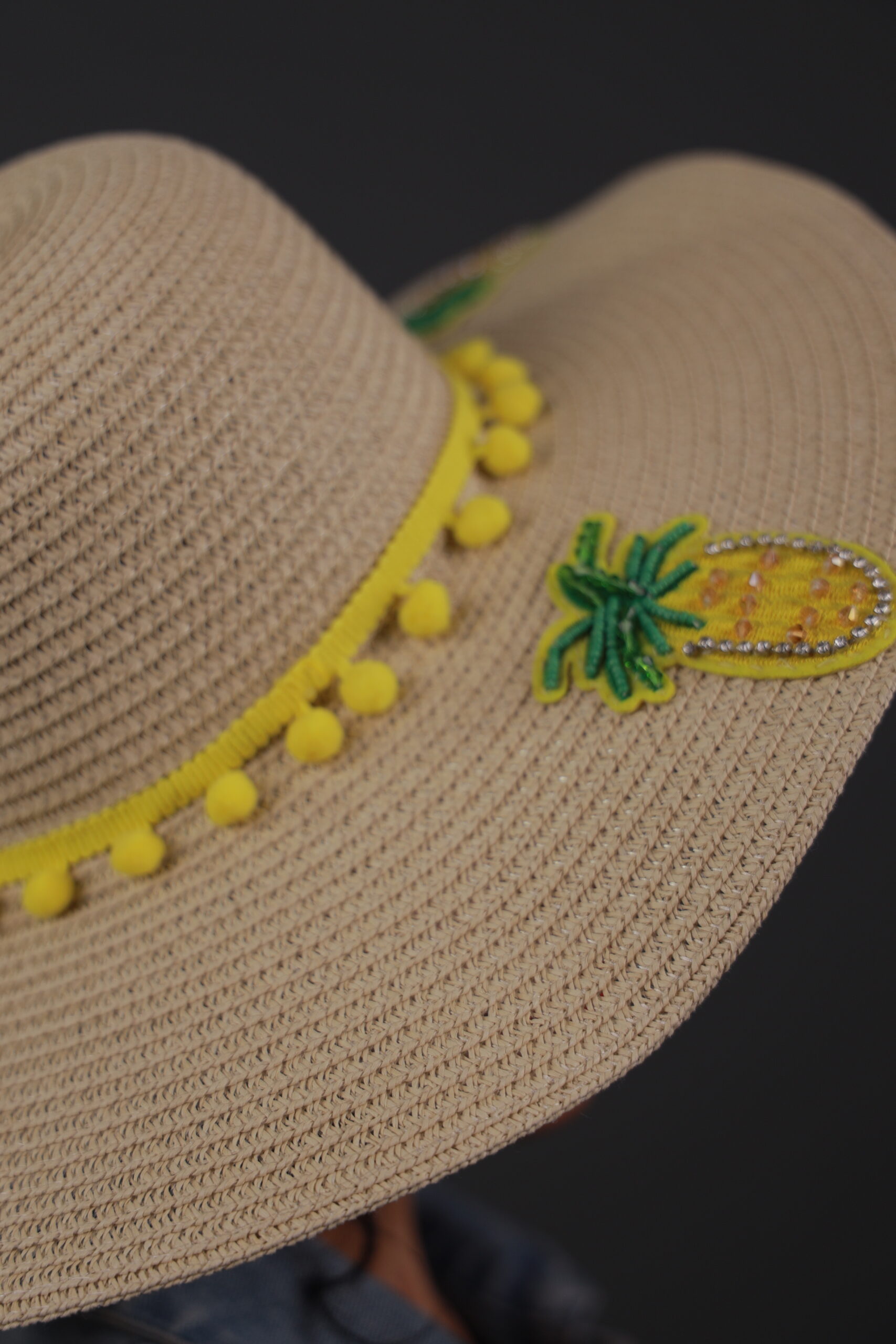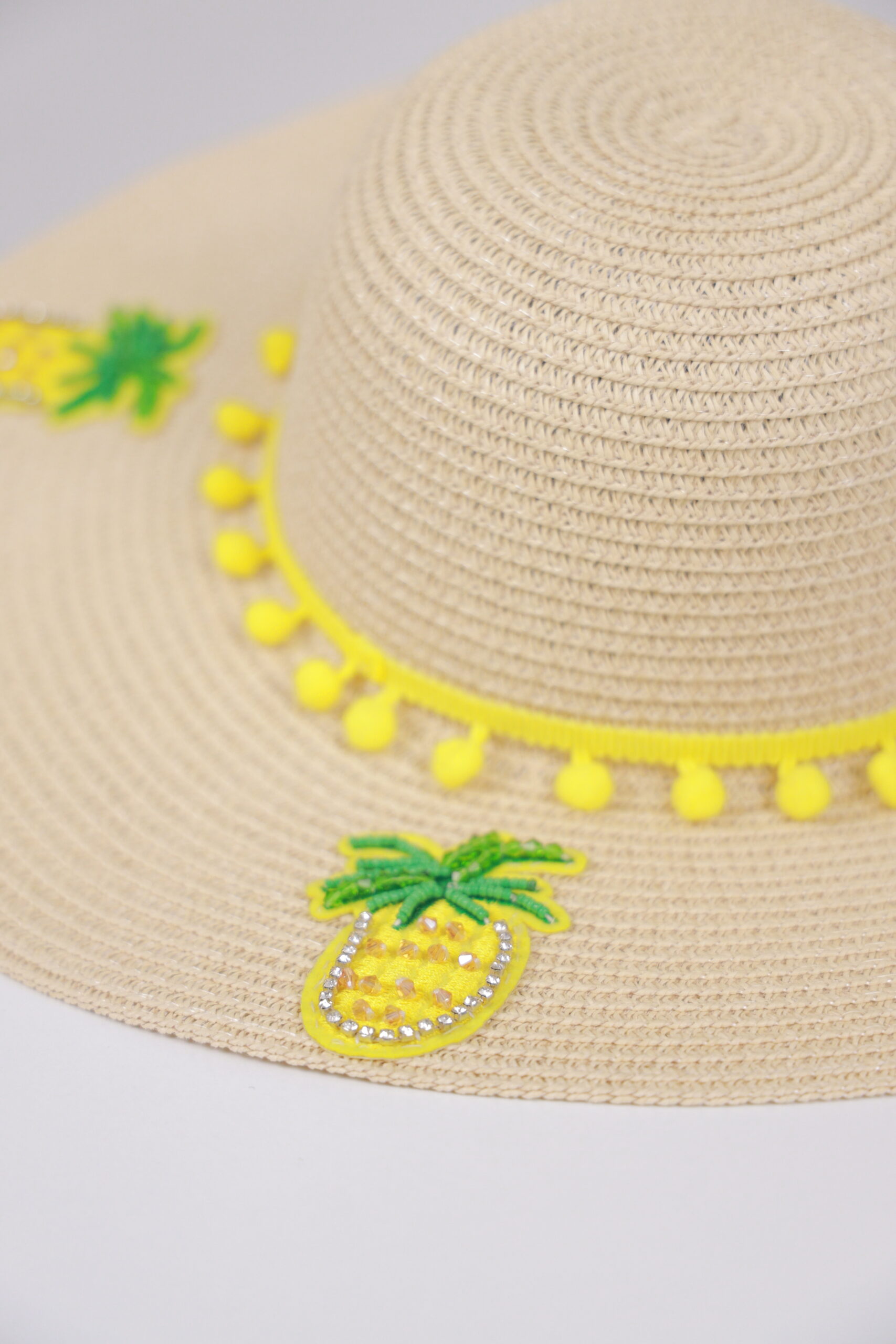 Features bright yellow pom-pom trim and playful pineapple appliqués accented with delicate rhinestones.