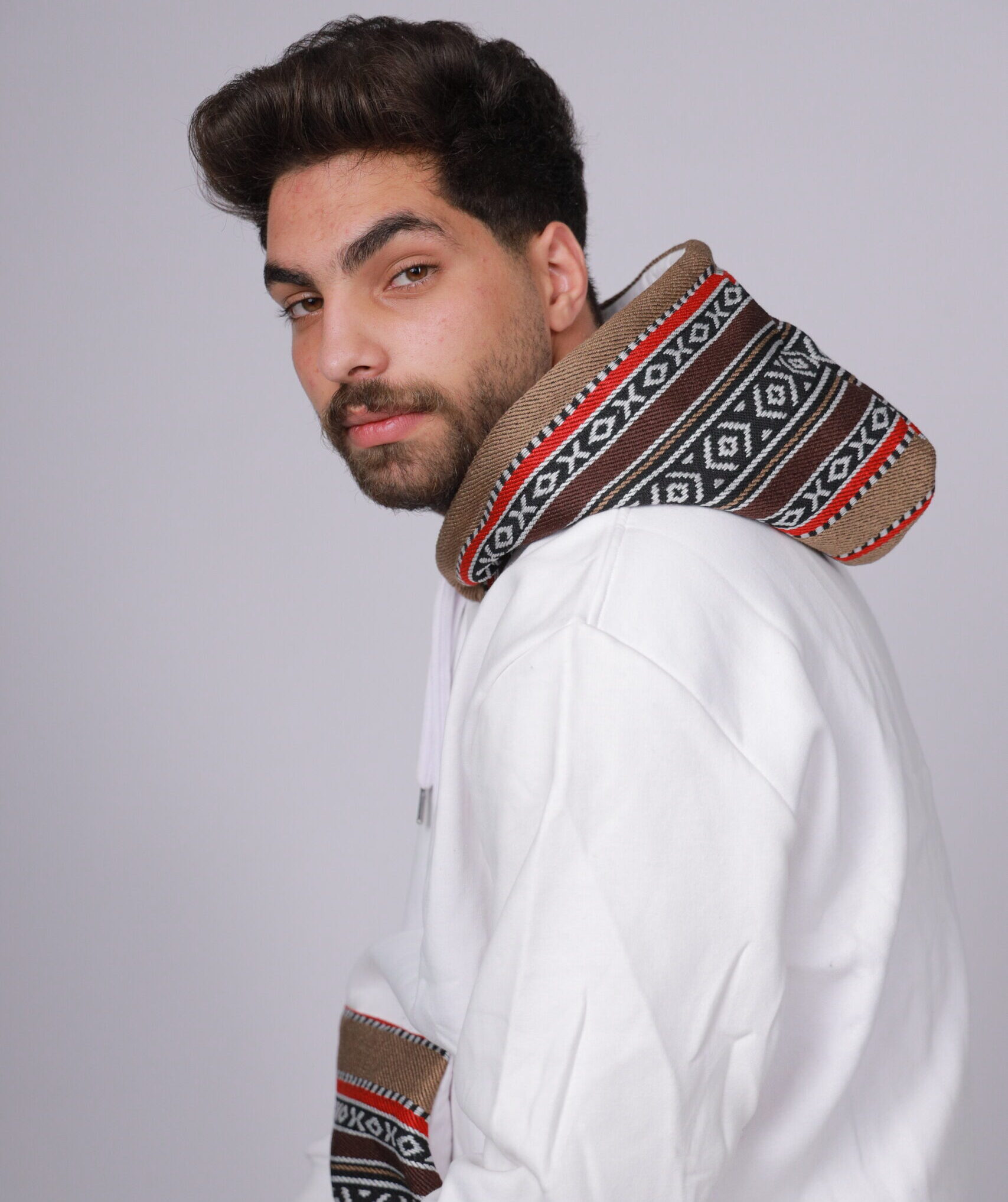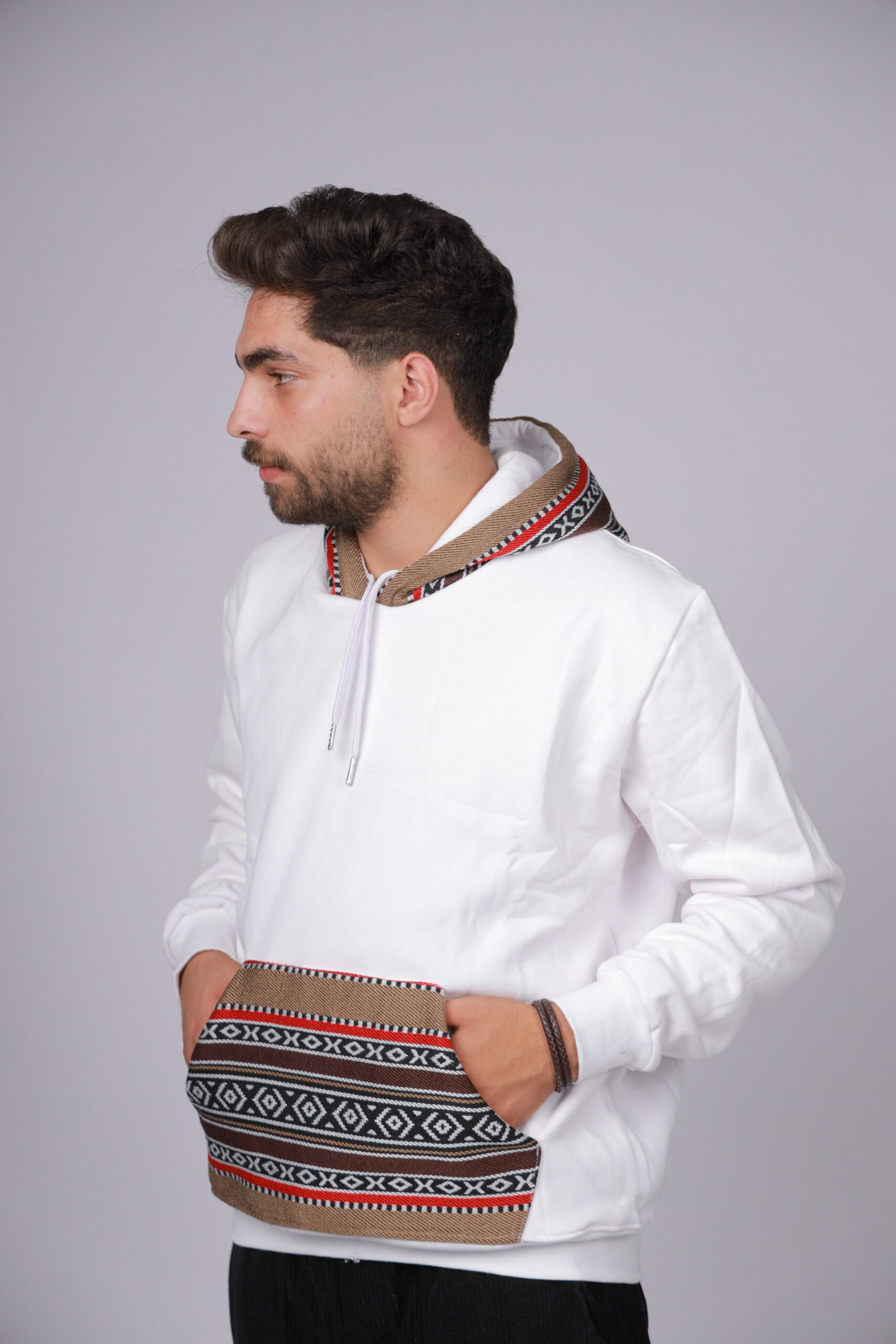 A crisp white pullover hoodie enhanced with brown Sadu-style woven fabric on the hood and kangaroo pocket, accented with black and red details. Made from 100% pure Egyptian cotton, it delivers exceptional softness, breathability, and lasting comfort while bringing a subtle Arabian-inspired touch to your casual look.