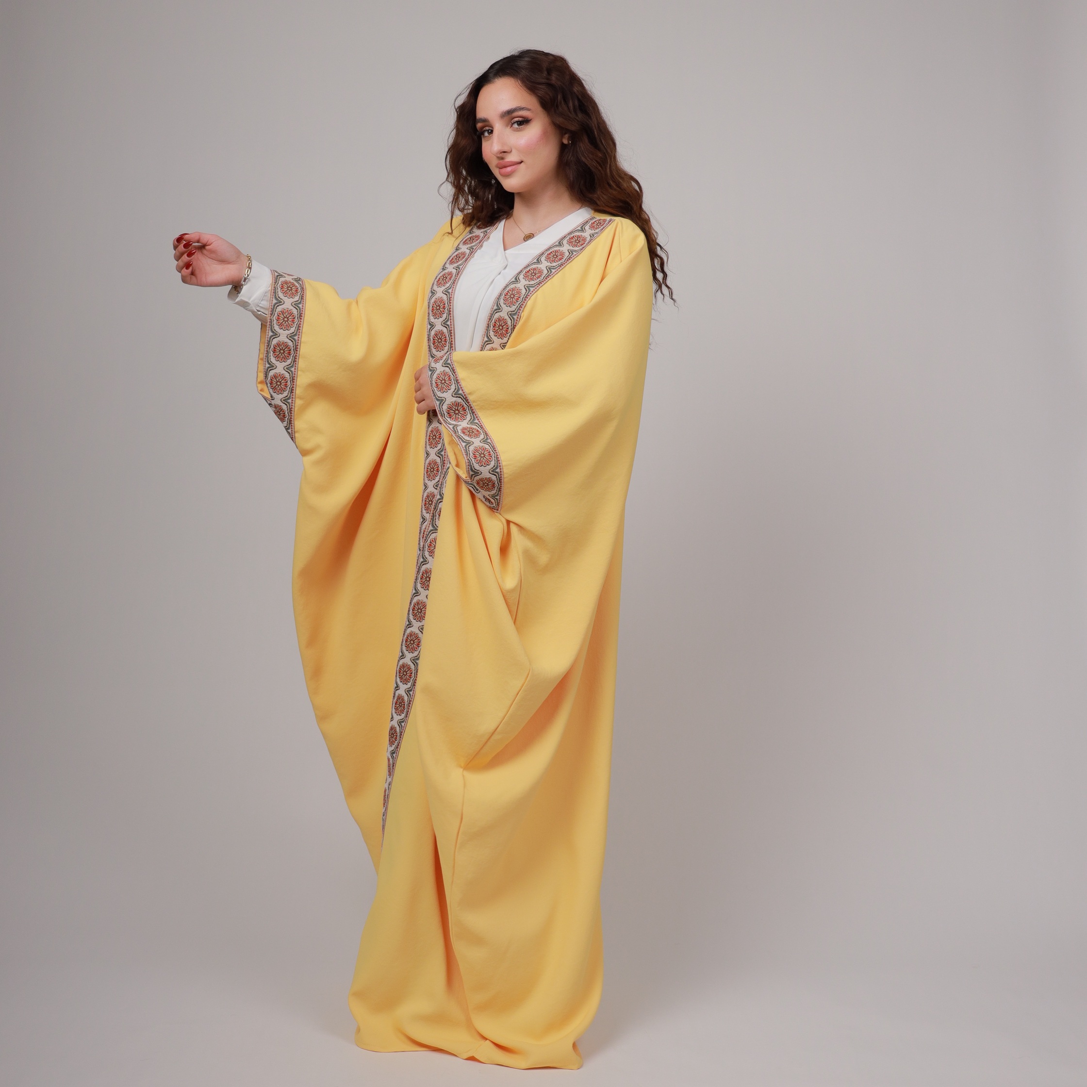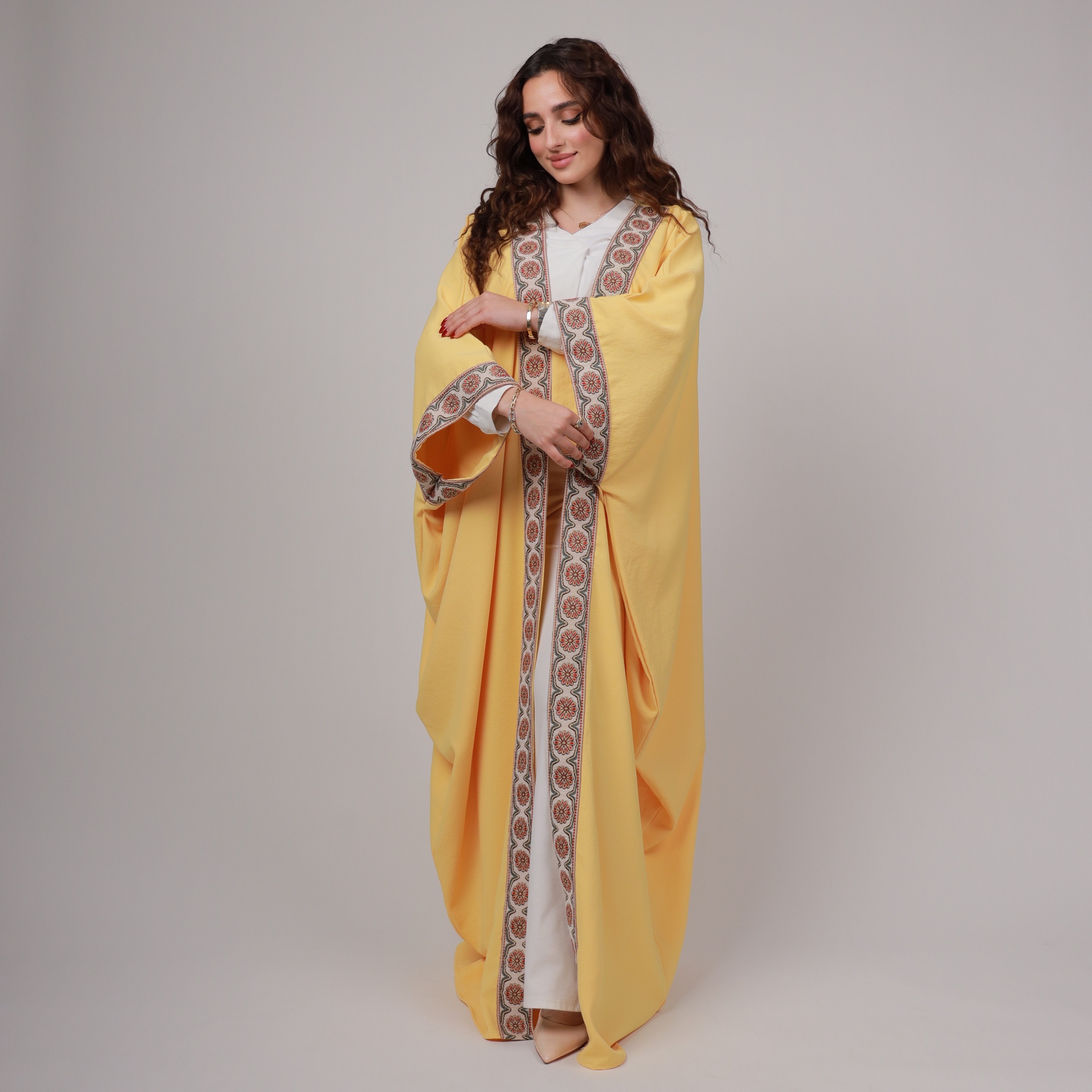 Radiate elegance in this airy yellow Bisht , crafted from luxurious Japanese CY fabric for a fluid drape and breathable comfort. The flowing silhouette is beautifully framed with intricately patterned trim in earthy tones, adding a touch of refined artistry to this vibrant piece. Perfect for daytime gatherings or evening occasions, this abaya blends traditional charm with a modern, uplifting hue.